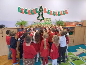 5 grudnia odwiedził nas Święty Mikołaj, który przyniósł wspaniałe prezenty. Tego dnia odbyły się również bożonarodzeniowe warsztaty florystyczne, podczas których dzieci tworzyły własne świąteczne stroiki z gałązek świerku, ozdób i pachnących dodatków. Zajęcia rozwijały kreatywność, zdolności manualne i wprowadziły wszystkich w wyjątkowy, świąteczny nastrój. W naszej grupie odbyły się także świąteczne warsztaty pieczenia pierników. Dzieci samodzielnie wałkowały ciasto, wykrawały ulubione kształty i dekorowały upieczone ciasteczka kolorowymi posypkami. Wspólne pieczenie sprawiło przedszkolakom wiele radości.
