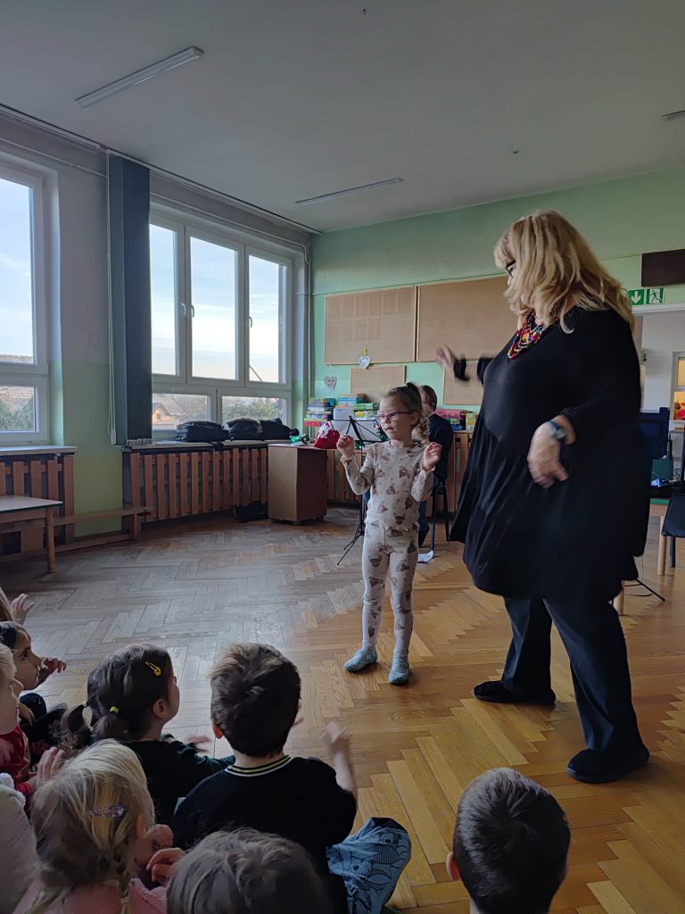 - podczas zabawy przy muzyce przedstawia różne emocje przy pomocy mimiki i ruchu,